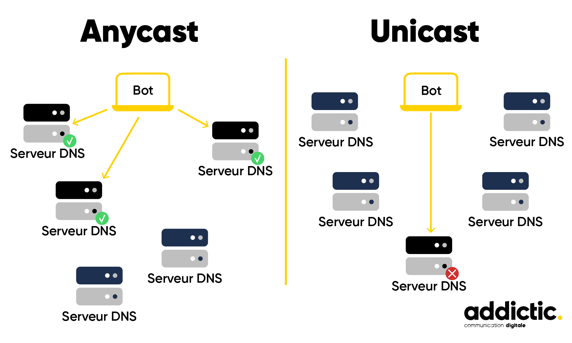 Le DNS Anycast est une technique d'adressage et de routage réseau où une seule adresse IP est attribuée à plusieurs serveurs répartis géographiquement. Contrairement au routage unicast, où une adresse IP unique pointe vers un seul serveur, le routage anycast permet à plusieurs serveurs de partager la même adresse IP. Lorsqu'une requête DNS est envoyée, elle est dirigée vers le serveur le plus proche ou le plus performant, en fonction de la topologie du réseau et de l'état actuel des serveurs.