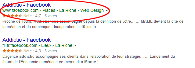 Dans les résultats, pour la page facebook, le fil d'ariane apparait avec le lieu géographique et l’activité. Sont également spécifiés la note et le nombre de votants (déclarées comme microdatas).