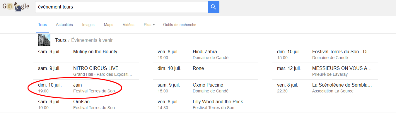 Nous avons fait une recherche d'évènement sur Tours, Google affiche une liste d'évènements avec des informations comme la date, le nom et le lieu sont citées. Pour les actualités, les microdatas affichées sont la source et l’heure de publication.