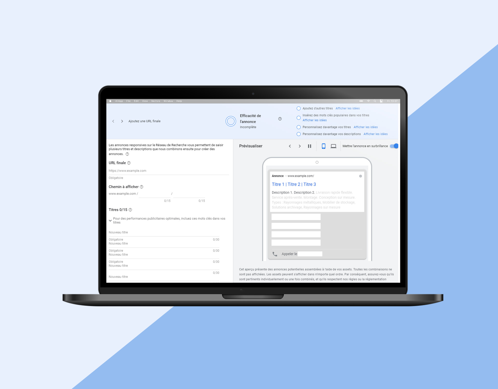 Une annonce textuelle agrandie se compose de trois titres, deux descriptions et éventuellement d’extensions (numéro de téléphone, liens supplémentaires,…). Ce sont des annonces fixes, les titres et descriptions s’affichent dans l’ordre indiqué par l’utilisateur. Une annonce responsive est très similaire, elle est aussi composée de titres, descriptions et extensions. La différence est que l’utilisateur peut indiquer jusqu’à 15 titres et 4 descriptions, et les algorithmes choisissent la combinaison qu’ils jugent la mieux adaptée au contexte de la recherche de l’internaute.